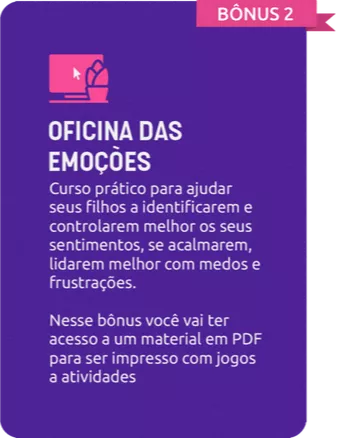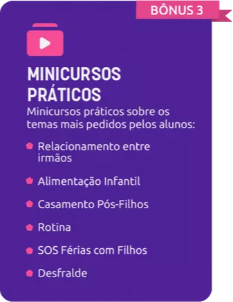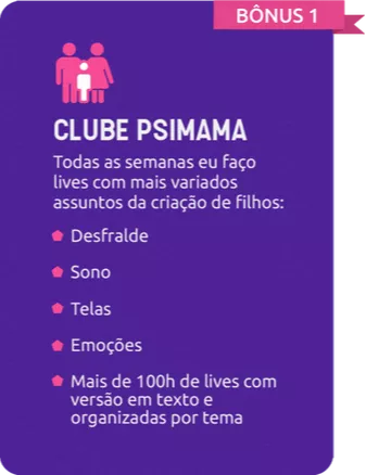 O curso completo com 6 módulos práticos, onde você vai aplicar os passos do Método PsiMama para você melhorar o comportamento dos seus filhos, e o seu, sem gritos castigos e palmadas. Vem em 2 versões, uma para as mães e uma para os pais!